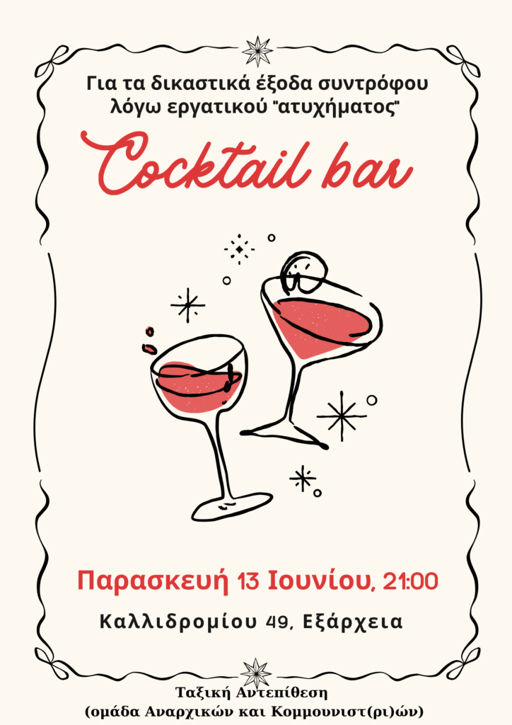 Αρχική ΚΟΙΝΩΝΙΑ ΕΚΔΗΛΩΣΕΙΣ Cocktail bar για τα δικαστικά έξοδα συντρόφου- μέλους της συλλογικότητάς μας, λόγω... ΚΟΙΝΩΝΙΑΕΚΔΗΛΩΣΕΙΣ Cocktail bar για τα δικαστικά έξοδα συντρόφου- μέλους της συλλογικότητάς μας, λόγω εργατικού “ατυχήματος”. 10 Ιουνίου, 2025 μερίδιο FacebookTwitter ΠΑΡΟΜΟΙΑ ΑΡΘΡΑΠΕΡΙΣΣΟΤΕΡΑ ΑΠΟ ΤΟΝ ΔΗΜΙΟΥΡΓΟ Εκδήλωση – Συζήτηση με τις συντρόφισσες Μαριάννα Μ. & Δήμητρα Ζ. Μπαρ οικονομικής ενίσχυσης Εκδήλωση για το Μarch to Gaza