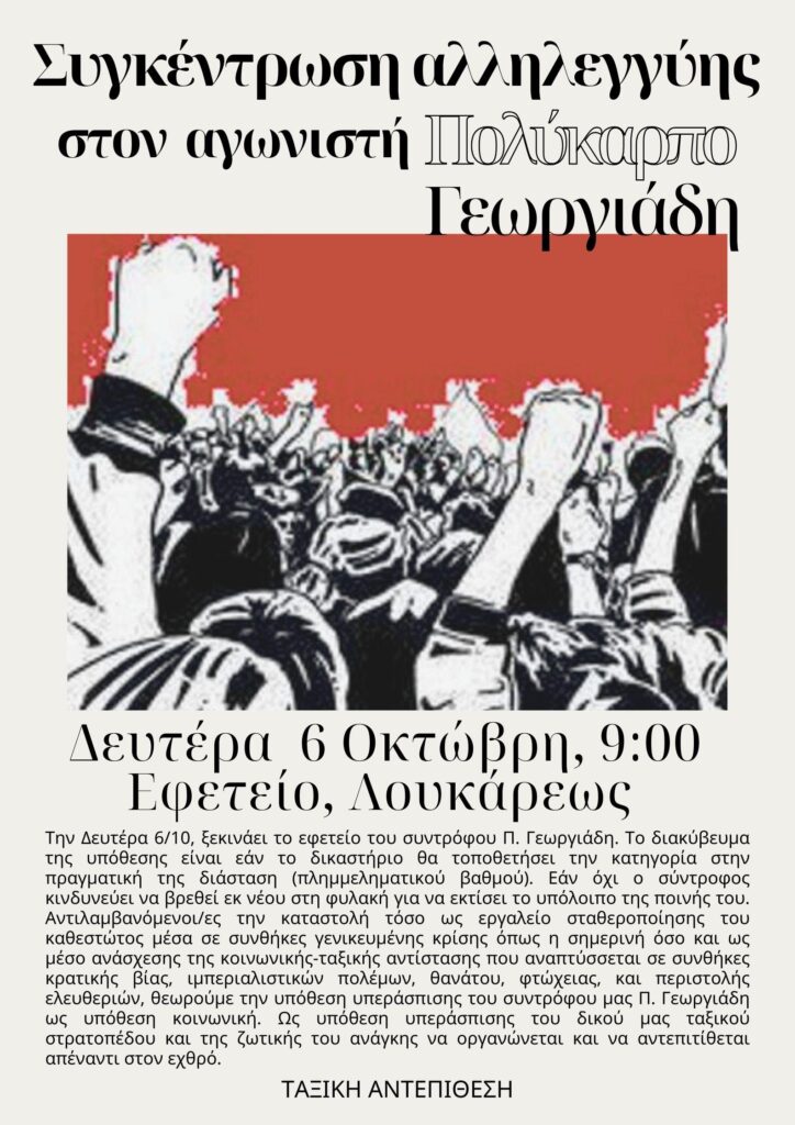 Συγκέντρωση αλληλεγγύης στον αγωνιστή σύντροφο Πολύκαρπο Γεωργιάδη [Δευτέρα 6 Οκτωβρίου, 9:00, 6ος όροφος, αίθουσα Δ120Γ, Εφετείο Λουκάρεως]