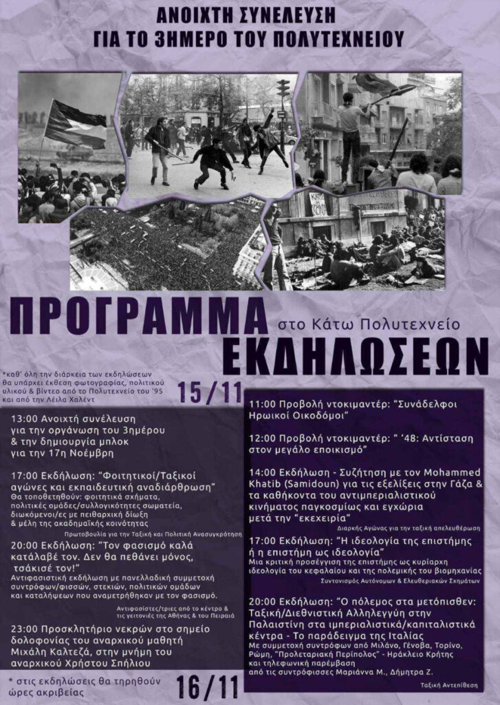 ΑΝΟΙΧΤΗ ΣΥΝΕΛΕΥΣΗ ΓΙΑ ΤΟ ΤΡΙΗΜΕΡΟ ΤΟΥ ΠΟΛΥΤΕΧΝΕΙΟΥ | Πρόγραμμα εκδηλώσεων 15-16/11 στο Κάτω Πολυτεχνείο