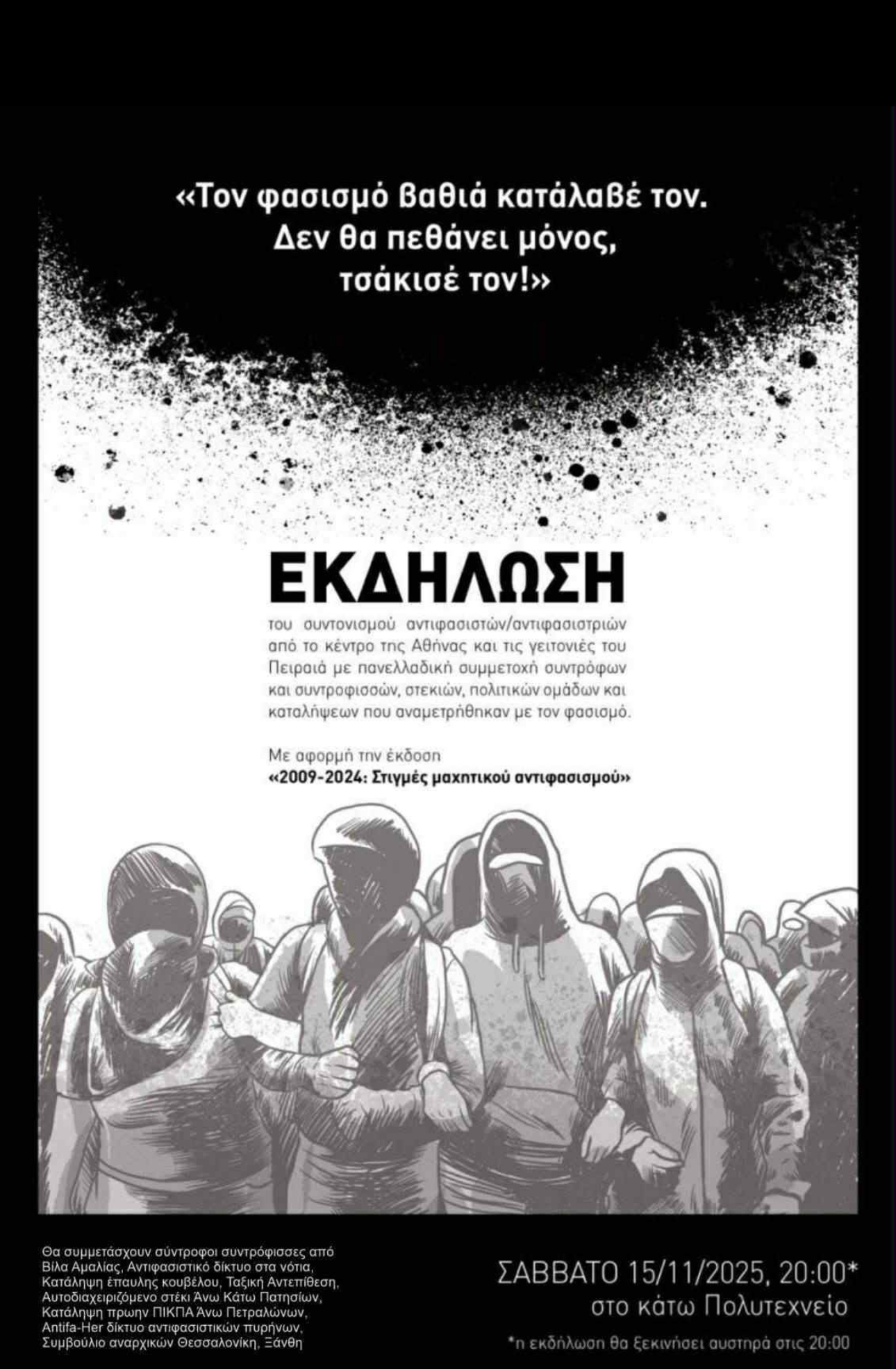 Εκδήλωση του συντονισμού αντιφασιστών/αντιφασιστριών από το κέντρο της Αθήνας και τις γειτονιές του Πειραιά με πανελλαδική συμμετοχή συντρόφων/συντροφισσών, στεκιών, πολιτικών ομάδων και καταλήψεων που αναμετρήθηκαν με τον φασισμό.