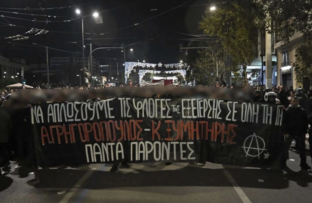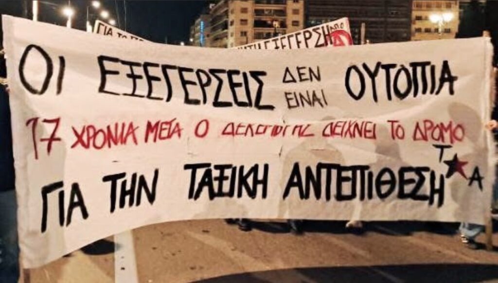 Ψηλά τις σημαίες της Αντίστασης κράτησε χθες η πορεία μνήμης και τιμής για τα 17 χρόνια από την κρατική αστυνομική δολοφονία του αναρχικού μαθητή Αλέξη Γρηγορόπουλου και τη μεγάλη κοινωνική εξέγερση που αυτή πυροδότησε. 17 Δεκέμβρηδες μετά και το μίσος παραμένει άσβεστο απέναντι στην κρατική βία και το καπιταλιστικό σύστημα που αυτή υπηρετεί. Κόντρα στην προληπτική καταστολή που έφτασε να τοποθετεί διμοιρίες ΜΑΤ σε απόσταση αναπνοής από το σημείο της δολοφονίας του Αλέξη πριν ακόμα από την έναρξη της απογευματινής διαδήλωσης, η πορεία ήταν μαζικότατη και με παλμό, με χιλιάδες κόσμου –με έντονο το νεολαιίστικο στοιχείο – να την πλαισιώνει, επιβεβαιώνοντας ότι η μνήμη της εξέγερσης είναι ζωντανή, ικανή να δίνει καύσιμα στους σύγχρονους αγώνες ενάντια στην αστική εξουσία που δολοφονεί στους δρόμους, στα εργασιακά σφαγεία, στα Τέμπη, την Πύλο, την ώρα που συγκαλύπτει βιαστές και προσδένεται όλο και πιο σφιχτά στο άρμα των παγκόσμιων φονιάδων και γενοκτόνων των λαών.