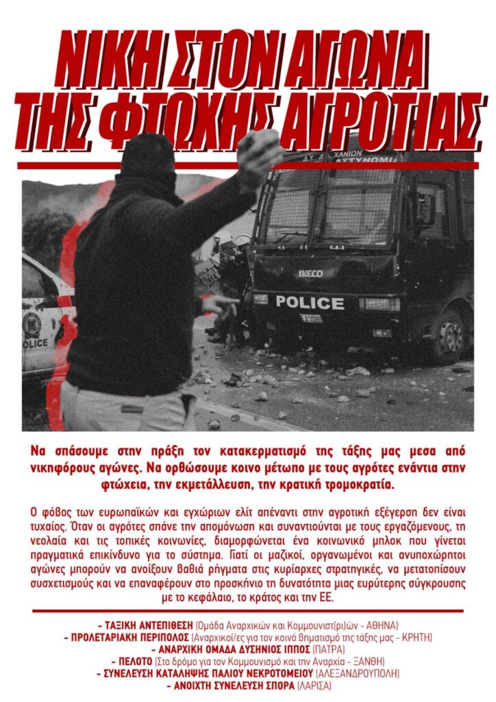 Σε αυτή τη συγκυρία, το έμπρακτο πολιτικό επίδικο που τίθεται επιτακτικά είναι το να στηριχθεί αποφασιστικά ο αγροτικός αγώνας. Γιατί μαζί με τον αφανισμό των μικροαγροτών δεν διακυβεύεται μόνο η επιβίωση ενός ακόμη κοινωνικού στρώματος, αλλά η ίδια η δυνατότητα ύπαρξης ενός ταξικού αναχώματος απέναντι στη γενικευμένη επίθεση που βιώνουμε. Η ήττα αυτού του αγώνα θα σηματοδοτήσει την ακόμη πιο εμφατική επιβολή ενός καθεστώτος αυταρχισμού, βίας και κοινωνικού κατακερματισμού, βαθαίνοντας συνολικά την επίθεση στην τάξης μας.